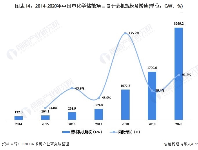 電化學(xué)儲能是利用化學(xué)電池將電能儲存起來并在需要時釋放的儲能技術(shù)及措施。在中國新能源發(fā)電規(guī)模大幅增長、鋰電池成本持續(xù)下降推動下,中國電化學(xué)儲能裝機(jī)規(guī)模一直保持高速增長的趨勢。截至2020年底,電化學(xué)儲能累計裝機(jī)規(guī)模為3269.2MW,同比增長91.2%。未來五年,隨著分布式光伏、分散式風(fēng)電等分布式能源的大規(guī)模推廣,電化學(xué)儲能行業(yè)將面臨更廣闊的市場機(jī)遇。