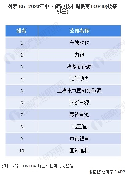根據(jù)《儲能產(chǎn)業(yè)研究白皮書2021》數(shù)據(jù)顯示,2020年,中國新增投運的電化學(xué)儲能項目中,裝機(jī)規(guī)模排名前十位的儲能技術(shù)提供商,依次為寧德時代、力神、?;履茉?、億緯鋰能、上海電氣國軒新能源、南都電源、贛鋒電池、比亞迪、中航鋰電和國軒高科。