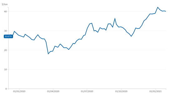 歐盟碳市場的穩(wěn)定結(jié)構(gòu)框架以及歐盟內(nèi)部長期政策的合理性在2020年的運行中得到較好體現(xiàn)。2020年是歐盟碳市場第三階段運行的最后一年,也是第四交易階段的密集準備階段,碳價格在3、4月有短期大幅下降,從年初最高29.68美元降至4月最低18.04美元,但5月后價格又逐漸回升,并在7月達到33.89美元,此后一直在30美元左右徘徊,最后在同年12月達到42.16美元。在未來,歐盟《綠色新政》一攬子復(fù)蘇計劃以及《歐盟氣候法》中包含的2030年的新目標將催生更大的氣候雄心,而碳市場的優(yōu)化改革將有助于實現(xiàn)這些氣候目標。