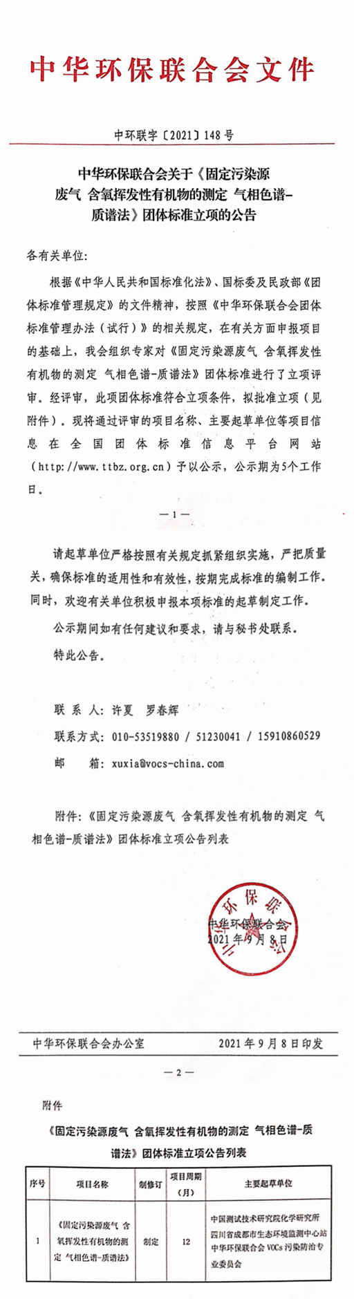 前言:經(jīng)前期的充分論證,由中國測試技術(shù)研究院化學(xué)研究所、四川省成都市生態(tài)環(huán)境監(jiān)測中心站和中華環(huán)保聯(lián)合會VOCs污染防治專業(yè)委員會等單位牽頭發(fā)起的全國團(tuán)體標(biāo)準(zhǔn)《固定污染源廢氣 含氧揮發(fā)性有機(jī)物的測定 氣相色譜-質(zhì)譜法》于2021年9月8日正式立項(xiàng)并按照要求發(fā)布在全國團(tuán)體標(biāo)準(zhǔn)信息平臺進(jìn)行公示。該標(biāo)準(zhǔn)研制工作將嚴(yán)格按照起草工作組組建、文本起草、征求意見、標(biāo)準(zhǔn)審查、報(bào)批和發(fā)布等程序開展,預(yù)計(jì)在2022年內(nèi)發(fā)布。按照相關(guān)文件精神,為充分發(fā)揮市場主體參與標(biāo)準(zhǔn)制定的作用,現(xiàn)面向全國有關(guān)企事業(yè)單位公開征集該標(biāo)準(zhǔn)起草工作組的參編單位。(注:參編單位范疇不局限于企業(yè),也包括國家及省市部門、環(huán)科院、規(guī)劃院、工程中心、重點(diǎn)實(shí)驗(yàn)室和高等院校等科研院所)