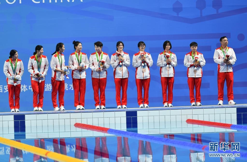 9月6日,第十四屆全運會跳水女子團體賽頒獎儀式在西安舉行,季軍陜西隊在頒獎儀式上。新華社記者張博文 攝