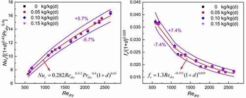 濕工質(zhì)中的含濕量顯著影響微通道回?zé)崞鞯膿Q熱性能,為了分析含濕量的定量影響,研究人員構(gòu)建了翼型-直通道新型耦合流動(dòng)換熱單元三維數(shù)理模型,討論了含濕量、流量和溫度等因素對(duì)耦合換熱的影響規(guī)律,對(duì)比了翼型結(jié)構(gòu)與直通道、之字形結(jié)構(gòu)的綜合流動(dòng)換熱性能。研究表明,增加含濕量可以提高高壓空氣的整體流動(dòng)換熱特性;在等泵功的條件下,交錯(cuò)排列的翼型翅片相比較于直通道和之字形通道具有最好的熱工水力特性。基于干工質(zhì)經(jīng)驗(yàn)關(guān)聯(lián)式,引入含濕量強(qiáng)化換熱因子,建立了高溫含濕煙氣和高壓濕空氣流動(dòng)換熱特性與含濕量的定量關(guān)聯(lián)式,定量描述了含濕量對(duì)傳熱和壓降特性的影響規(guī)律(見圖2)。