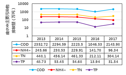 根據(jù)2013-2017年《中國(guó)統(tǒng)計(jì)年鑒》,我國(guó)廢水排放總量保持在700億噸,其中廢水中COD、氨氮(NH4+)、總氮(TN)、TP排放量如下圖,可見2015年國(guó)務(wù)院發(fā)布了《水污染防治行動(dòng)計(jì)劃》(簡(jiǎn)稱“水十條”)后,這幾種污染物排放量得到了削減。