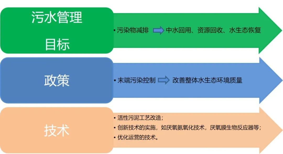 近幾十年來,中國(guó)污水行業(yè)經(jīng)歷了高速增長(zhǎng),在基礎(chǔ)設(shè)施建設(shè)、技術(shù)創(chuàng)新、人才培養(yǎng)等方面取得了進(jìn)步,為未來的智慧化、低碳化、資源化發(fā)展奠定了堅(jiān)實(shí)的基礎(chǔ)。然而,未來仍然充滿不確定性和挑戰(zhàn)。預(yù)計(jì)隨著人口的持續(xù)增長(zhǎng)和城市化進(jìn)程,水資源短缺將更加嚴(yán)重,而污水量將進(jìn)一步增加。這將要求污水管理目標(biāo)、政策和技術(shù)發(fā)生根本性變化,如下圖:
