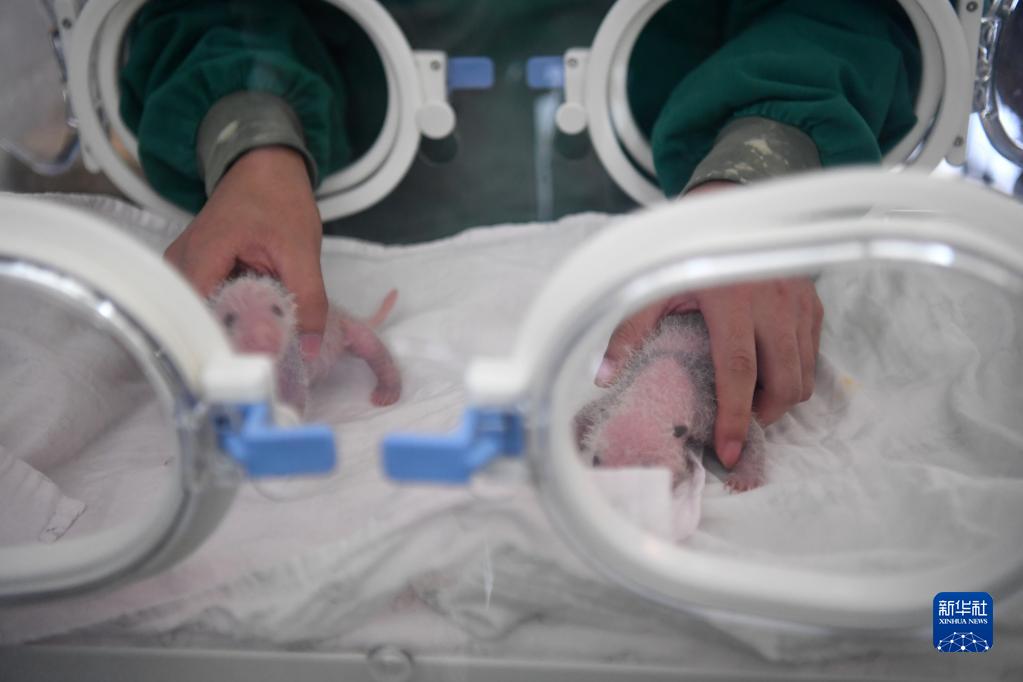 9月23日,重慶動(dòng)物園工作人員在大熊貓館育幼室內(nèi)照顧雙胞胎幼仔。