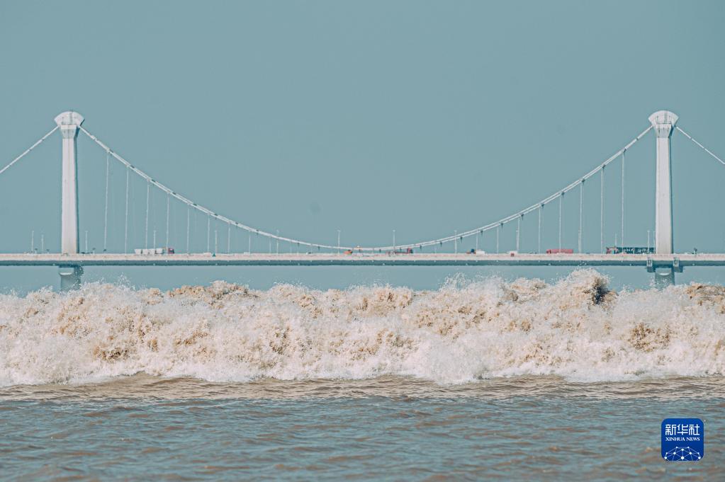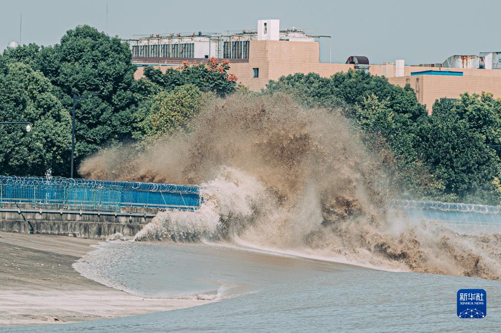 9月23日,錢塘江潮水沖擊堤壩形成巨浪。