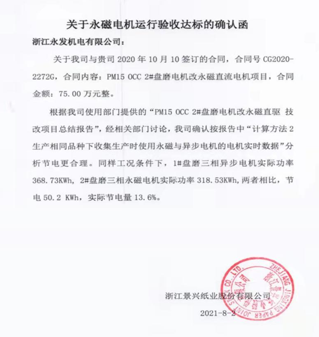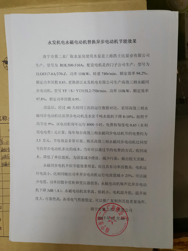 10年來(lái)永發(fā)先后為造紙、水泥、水利、鋼鐵、印染、軍工等行業(yè),千島湖飲水工程等項(xiàng)目貢獻(xiàn)了大量的高效高低壓電動(dòng)機(jī)、超高效高低壓永磁同步產(chǎn)品,助力節(jié)能減排。其中很多產(chǎn)品都屬于首臺(tái)套,永發(fā)機(jī)電永磁直驅(qū)電機(jī)與智能化系統(tǒng)也被水利廳列入新技術(shù)推廣目錄。