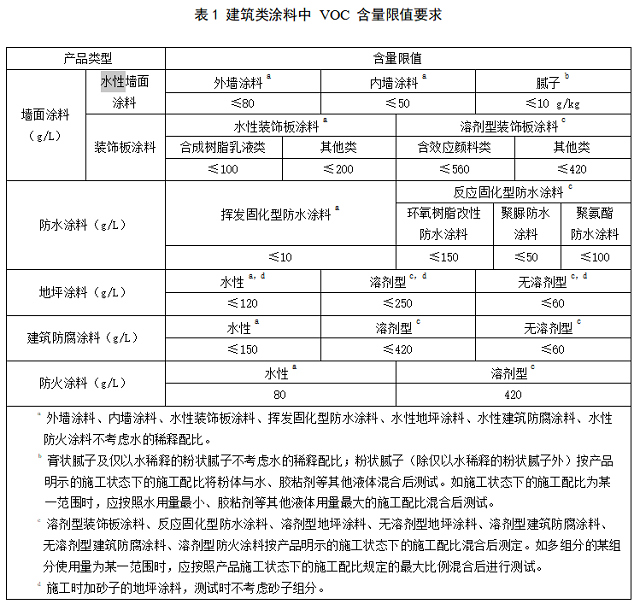 5.1 建筑類涂料中 VOC 含量限值應(yīng)符合表 1 的要求。