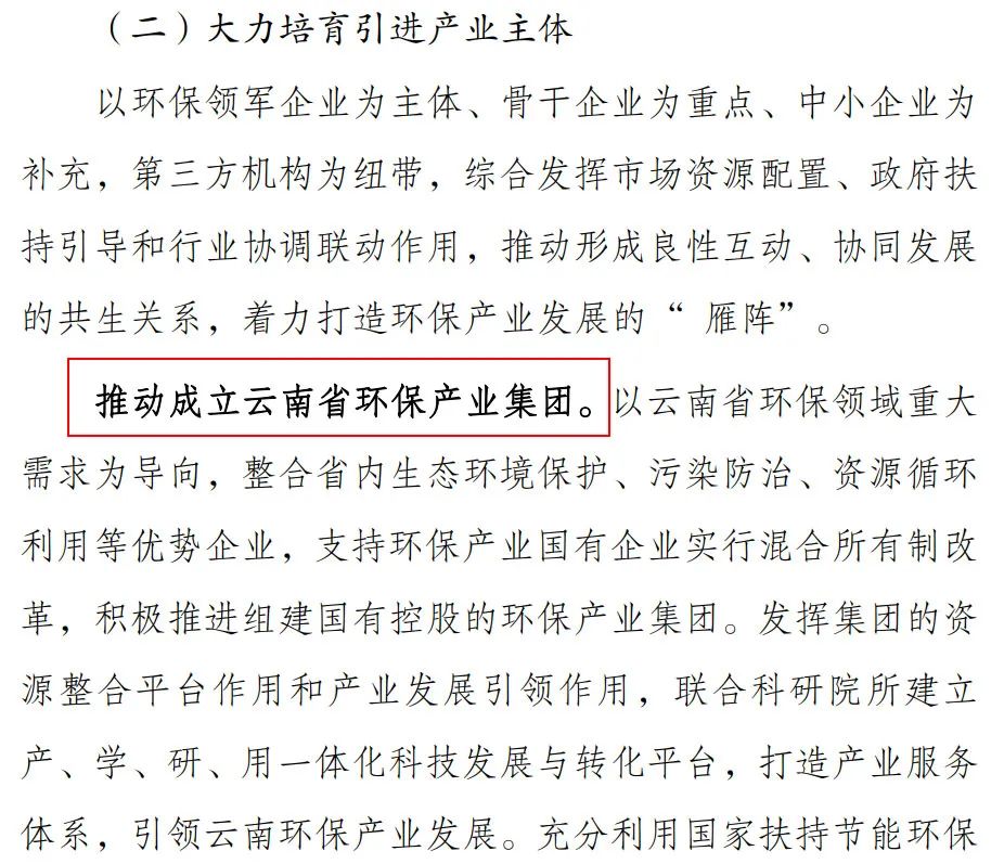 不過,這個“福建省生態(tài)環(huán)保集團”到底什么時候組建完成,其中都包括什么內容,一切具體的信息就都不知道了。還有云南,今年7月,云南省發(fā)布《云南省“十四五”環(huán)保產業(yè)發(fā)展規(guī)劃(征求意見稿)》,其中提到,要推動成立云南省環(huán)保產業(yè)集團。以云南省環(huán)保領域重大需求為導向,整合省內生態(tài)環(huán)境保護、污染防治、資源循環(huán)利用等優(yōu)勢企業(yè),支持環(huán)保產業(yè)國有企業(yè)實行混合所有制改革,積極推進組建國有控股的環(huán)保產業(yè)集團。