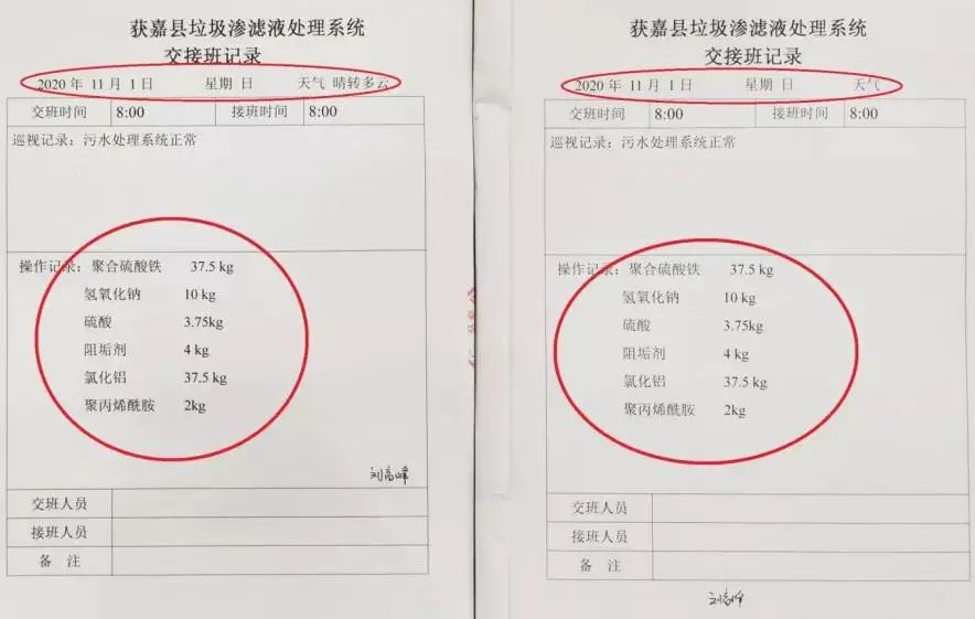 ▼獲嘉縣垃圾臨時(shí)填埋坑滲濾液處理系統(tǒng)交接班記錄同一天重復(fù)造假