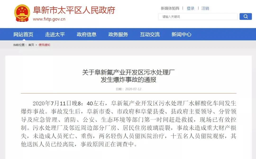 2020年7月12日,遼寧省阜新市太平區(qū)人民政府發(fā)布了一則《關(guān)于阜新氟產(chǎn)業(yè)開發(fā)區(qū)污水處理廠發(fā)生爆炸事故的通報(bào)》。其中顯示,2020年7月11日晚8:40左右,阜新氟產(chǎn)業(yè)開發(fā)區(qū)污水處理廠水解酸化車間發(fā)生爆炸事故。