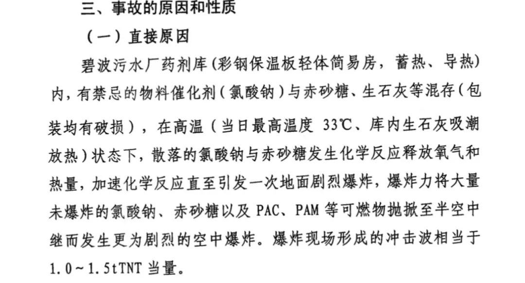 近日,阜新市應(yīng)急管理局已經(jīng)發(fā)布了《阜新氟產(chǎn)業(yè)開發(fā)區(qū)碧波污水處理廠“7.11”一般爆炸事故調(diào)查報(bào)告》(下稱《報(bào)告》)。結(jié)果顯示,爆炸的直接原因是該污水廠違規(guī)使用氯酸鈉催化劑,在儲(chǔ)存時(shí)與赤砂糖發(fā)生化學(xué)反應(yīng)發(fā)生爆炸,爆炸現(xiàn)場形成的沖擊波相當(dāng)1.0-1.5tTNT當(dāng)量。