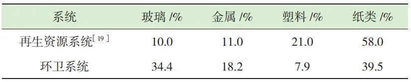 可回收物理論上包括各類可以回收利用的組分,一些組分具有較高的市場售價,往往進入再生資源系統(tǒng)。而另一些組分可以回收但市場價格較低,需要環(huán)衛(wèi)系統(tǒng)進行兜底回收。表 3為進入再生資源系統(tǒng)和環(huán)衛(wèi)系統(tǒng)的玻金塑紙的比例,可以看出環(huán)衛(wèi)系統(tǒng)回收的玻璃等低值可回收物的數量要明顯高于再生資源系統(tǒng),而紙類和塑料則相反?!皟删W”融合與規(guī)范回收是許多城市垃圾分類工作的重點,一方面推動管理機制融合,另一方面加快回收設施的融合和數據的共享。