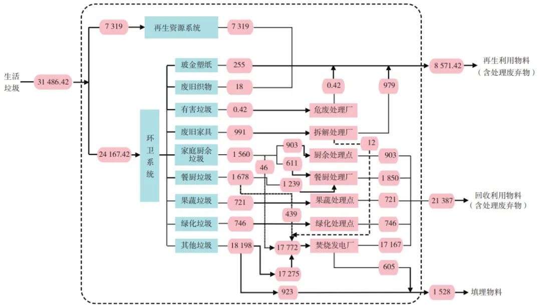 圖3 2020年10月深圳市生活垃圾分類系統(tǒng)物質流示意(單位:t/d)