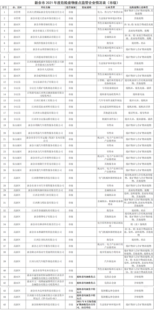 關(guān)于發(fā)布新余市危險(xiǎn)廢物重點(diǎn)監(jiān)管企業(yè)(2021年更新)的公告