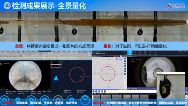 全景量化檢測(cè)技術(shù)將管道以剖面圖展開的形式,將管道上所有缺陷在全景圖和量化圖上進(jìn)行展示。全景圖和量化圖的展示有所不同:全景圖是將管道內(nèi)部全景以一張圖片的方式呈現(xiàn);量化圖是對(duì)于缺陷,可以進(jìn)行精確量化。高清視頻、激光輪廓、全景圖、色譜圖綜合展示,用戶可以在全景圖中查缺陷,并自動(dòng)關(guān)聯(lián)激光輪廓數(shù)據(jù)、視頻對(duì)應(yīng)幀,簡(jiǎn)單有效。