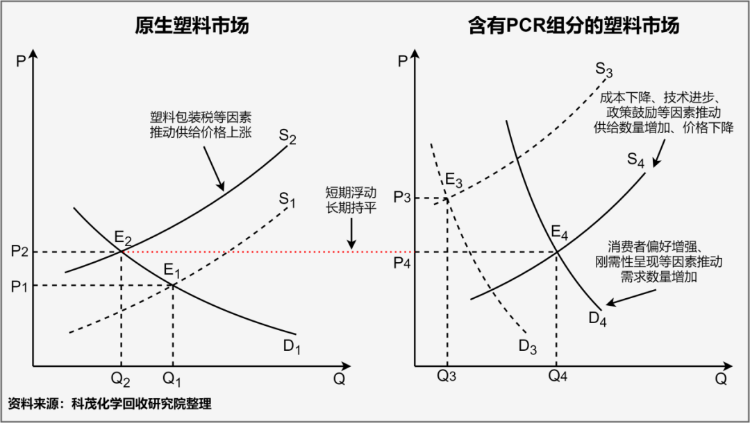 過去由于化學回收技術水平低、生產成本高、政策支持少、市場預期低等因素,導致PCR塑料供應數量少、價格高;同時由于剛性需求尚未呈現(xiàn)、消費者偏好不足、替代品(純原生塑料)價格低等因素,導致PCR塑料需求數量少,因此含化學回收PCR組分塑料市場的理論均衡點E3在現(xiàn)實中幾乎不存在。近年來供需要素變化,使含PCR組分塑料的理論均衡價格從過去不可接受的程度,下降至現(xiàn)在雖然較高但可以接受的水平。