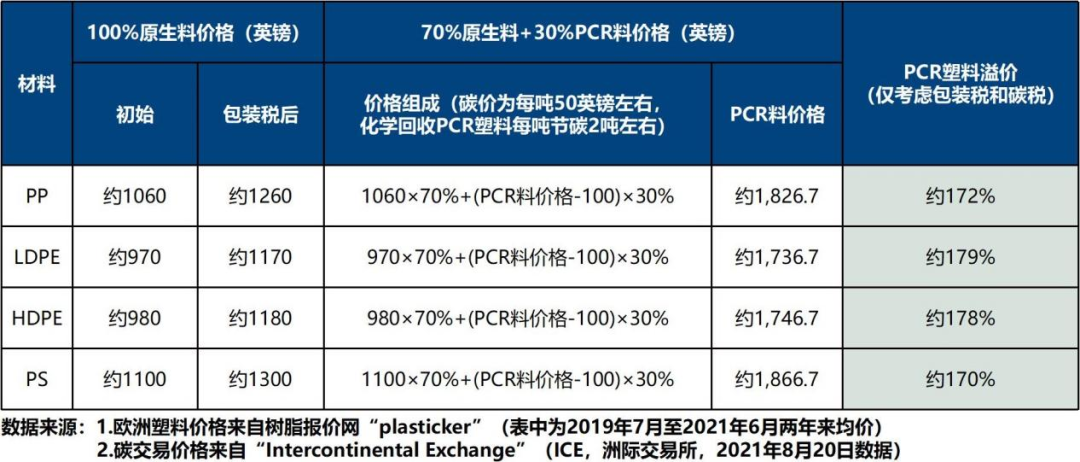 表6 考慮英國包裝稅和碳稅情況下的PCR塑料溢價估算