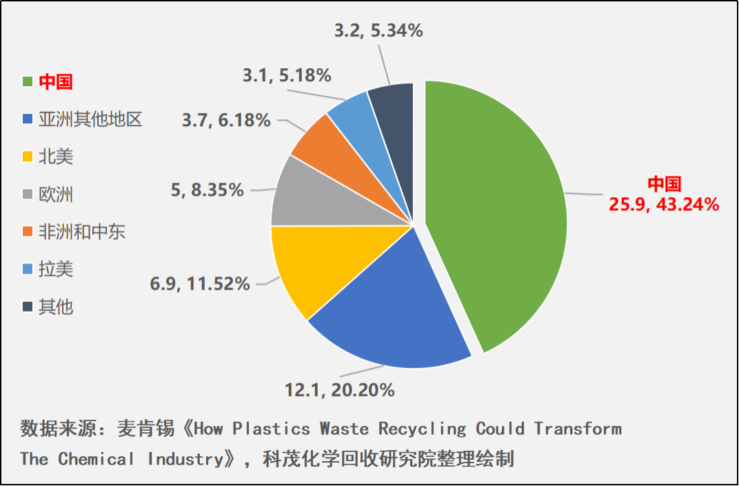 中國的發(fā)展在全球處于中等水平,人均垃圾產生量基本處于全球平均水平。按照人口數量計算,全球廢塑料體量大約為中國的5倍,即全球每年新增塑料垃圾4億噸左右,其中約2億噸可通過化學回收處理。垃圾填埋場陳腐垃圾中的廢塑料約有23億噸,或許只能通過化學回收處理。