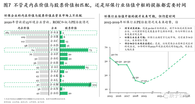 但必須承認(rèn)的是,向好趨勢的背后,我國資本市場的制度完善仍需時間。首先是生態(tài)環(huán)保企業(yè)內(nèi)在價值與股票價值的相匹配需要時間,在對生態(tài)環(huán)保企業(yè)2020年營收前15強的營收、ROIC加權(quán)和PE倍數(shù)進行分析得到,多數(shù)企業(yè)(如企業(yè)A、E、I、M)的內(nèi)在價值與股票價值在資本市場上并不匹配。其次是生態(tài)環(huán)保估值中樞的提升仍需時日,盡管隨著國家政策的提振、生態(tài)環(huán)保行業(yè)的發(fā)展、部分細(xì)分行業(yè)企業(yè)現(xiàn)金流狀況的改善,環(huán)保估值中樞提升未來可期,但也并不是一蹴而就的(見圖7)。