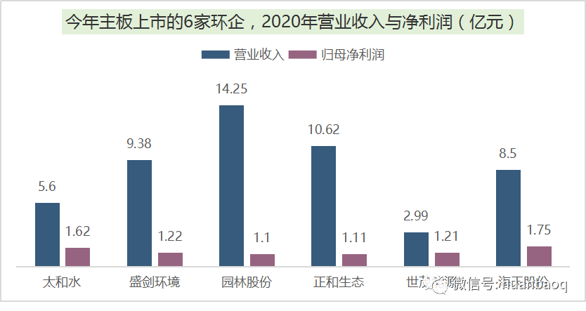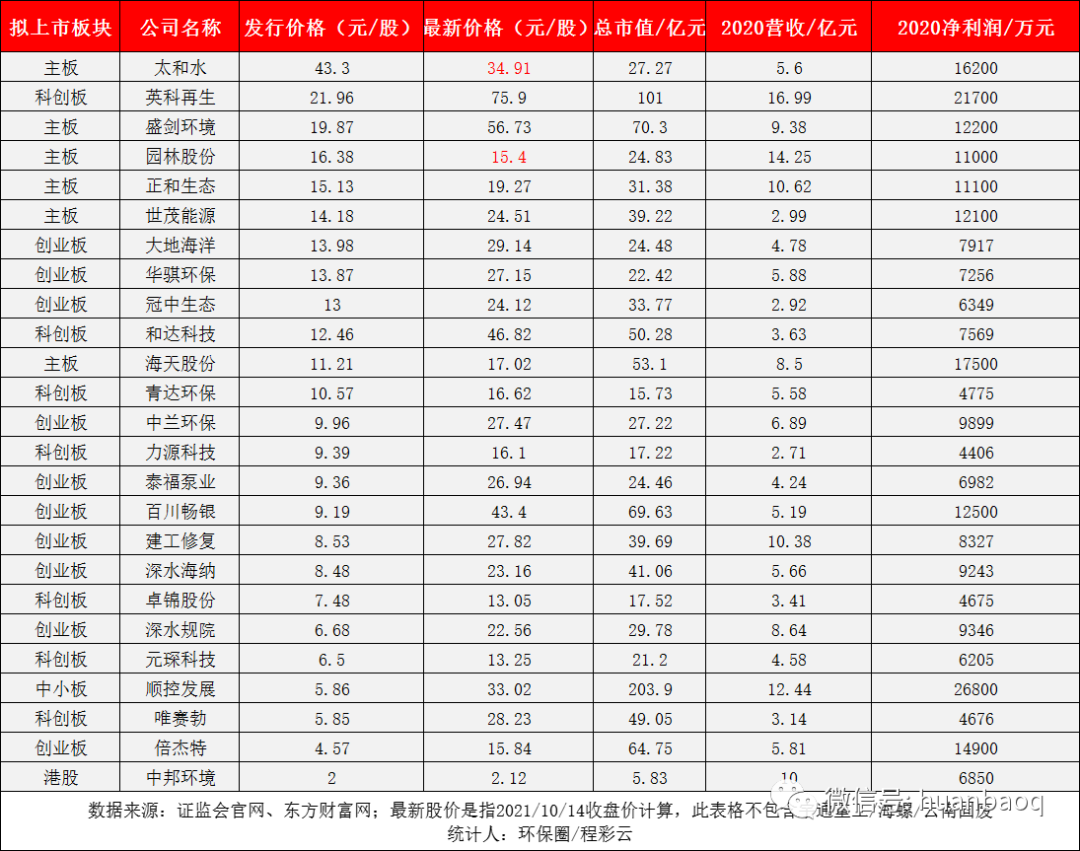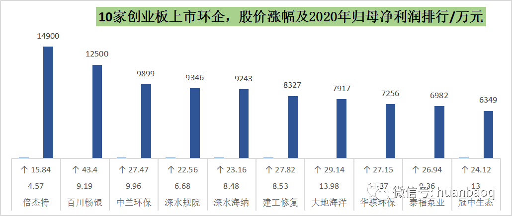 接下來,再說說大家比較關(guān)心的,今年上市企業(yè)的股價漲幅、最新市值和盈利水平。我們選擇主板、創(chuàng)業(yè)板、科創(chuàng)板上市的企業(yè)分別進行對比。今年在主板上市的共有7家企業(yè),分別為太和水、園林股份、海天股份、盛劍環(huán)境、世茂能源、正和生態(tài)和宇通重工,由于宇通重工是通過大股東摘帽變更方式上市而來,暫且不對其進行評價。剩下6家企業(yè)中,根據(jù)10月14日的收盤價,太和水和園林股份竟然跌破發(fā)行價,尤其是太和水,從發(fā)行價的43.3元/股跌至34.91元/股,總市值蒸發(fā)了近14億元。而同為主板上市的盛劍環(huán)境則表現(xiàn)極佳,這家從事半導(dǎo)體廢氣治理、煙氣凈化的公司,在國內(nèi)半導(dǎo)體產(chǎn)業(yè)大發(fā)展背景下,股價從19.87元/股漲至56.73元/股,總市值升至70.3億元,成為今年主板上市市值最高環(huán)保企業(yè)。這6家主板上市環(huán)企,2020實現(xiàn)營業(yè)收入大多位于5億元-14億元之間,歸母凈利潤也大多在1億元-2億元,營收最高的是杭州園林股份的14.25億元,凈利最高的則是成都海天股份的1.75億元。自上市以來,海天股份動作頻頻,半年前還收購了新開元等4座污水廠,然后又擬與康恒合資開公司,開拓四川垃圾焚燒/固廢業(yè)務(wù)。▼圖七:6家主板上市環(huán)企,2020年營收與凈利潤相對于主板上市企業(yè)的表現(xiàn)平平,今年10家在創(chuàng)業(yè)板上市的環(huán)企,股價清一色迎來大增,從8元-9元小盤股漲至20元-40元的中小型股,大多翻了2倍,或許跟創(chuàng)業(yè)板估值起飛有關(guān)。其中,百川暢銀(垃圾填埋氣發(fā)電)和倍杰特(高鹽度工業(yè)廢水治理)值得一說,不是由于股價翻了幾翻,而是在于它們卓越的賺錢能力。相較于其他上市環(huán)企的幾千萬凈利,去年在飽受疫情沖擊的情況下,這兩家企業(yè)的凈利潤竟然都過了億,比老牌上市企業(yè)盈利能力還要強。▼圖八:10家創(chuàng)業(yè)板上市環(huán)企,2020年凈利潤排行接著,我們再看科創(chuàng)板,相對于去年的11家,今年科創(chuàng)板上市的環(huán)企只有7家,分別是英科再生、和達科技、青達環(huán)保、力源科技、卓錦股份、元琛科技、唯賽勃。這7家企業(yè),除了英科再生(塑料回收再生)2020年歸母凈利潤遙遙領(lǐng)先之外,其余幾家凈利潤都在幾千萬左右。值得一提的是膜企唯賽勃,去年營收和凈利潤雙雙下滑,其中凈利潤下滑30%至4674萬元,這也從側(cè)面說明了科創(chuàng)板企業(yè)過會門檻相對較低。▼圖九:7家科創(chuàng)板上市環(huán)企,2020年凈利潤排行