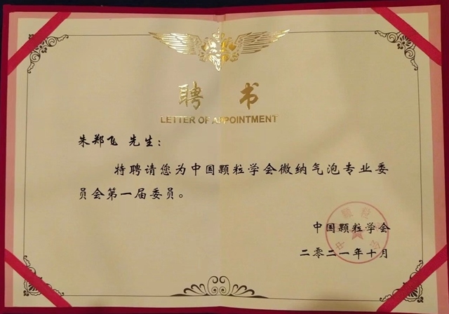 2021年10月22日-25日,微納氣泡委員會年會在中國常州召開。本次年會由中國顆粒學會主辦,江蘇如克環(huán)保設備有限公司(以下簡稱“如克環(huán)保”)應邀參加,并提供年會贊助。會上,如克環(huán)??偟闹爨嶏w總經理被聘任為微納氣泡委員會第一屆委員。