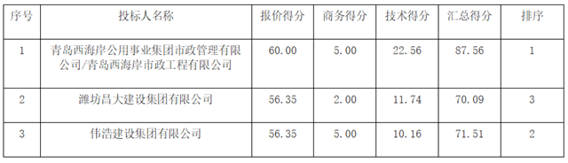 第1名:青島西海岸公用事業(yè)集團市政管理有限公司/青島西海岸市政工程有限公司(聯(lián)合體);第2名:偉浩建設集團有限公司;第3名:濰坊昌大建設集團有限公司。