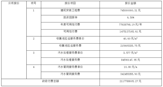 雙方合作期限20年,建設期1年、運營期19年。采用建設-運營-移交(BOT)的操作模式,于合作期滿后,由項目公司將項目資產(chǎn)無償移交給政府或其他政府指定機構。預中標項目投資90404萬元,政府付費2117788005.27元。