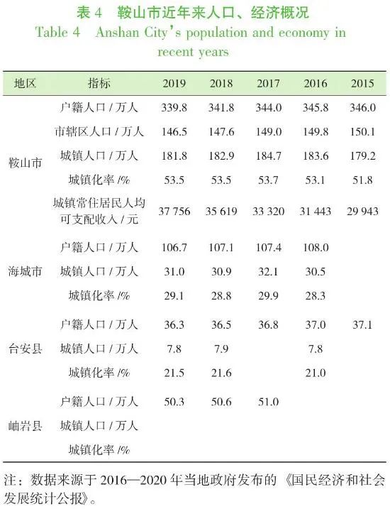 根據(jù)當(dāng)?shù)亟?jīng)濟和社會發(fā)展公報(表4),鞍山市的總戶籍人口和城鎮(zhèn)人口都呈現(xiàn)緩慢減少的趨勢,而城鎮(zhèn)化率近幾年保持在53%左右。在鞍山市內(nèi)部,存在鄉(xiāng)村人口逐漸向縣城(海城、臺安、岫巖)遷移,而縣城人口逐漸向鞍山市區(qū)遷移的趨勢。根據(jù)近幾年的趨勢,按戶籍人口每5 a減少2%估計,則鞍山市2030年戶籍人口為326萬人,城鎮(zhèn)化率達(dá)到60%。