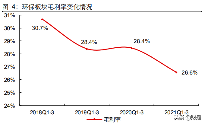 費(fèi)用端得到控制:2021Q1-Q3環(huán)保板塊期間費(fèi)用累計(jì)支出為361.8億元,同比增14.6%, 期間費(fèi)用率同比降1.2pct至15.7%。費(fèi)用率方面,銷售費(fèi)用率 2.8%,同比降0.41pct;管理費(fèi)用(含研發(fā)費(fèi)用,下同)率8.8%,同比降 0.37pct;財(cái)務(wù)費(fèi)用率4.1%,同比降0.41pct。期間費(fèi)用率同比下行的主要原因是:疫情后,收入同比大幅增長23.3%,致期間費(fèi)用率顯著下行。2021Q1-Q3期間費(fèi)用增速分別為:檢測同比增31.3%,期間費(fèi)用率同比降 1.1pct至33.6%;水務(wù)運(yùn)營同比增20.4%,期間費(fèi)用率同比降1.1pct至14.7%;監(jiān)測同比增17.8%,期間費(fèi)用率同比增4.8pct至42.5%;固廢同比增15.0%,期間費(fèi)用率同比降0.55pct至11.8%;大氣同比增10.3%,期間費(fèi)用率同比降 0.88pct至14.4%;水(工程設(shè)備)同比增9.6%,期間費(fèi)用率同比降 4.0pct 至 20.5%;節(jié)能同比增2.4%,期間費(fèi)用率同比降2.2pct 至 13.8%。