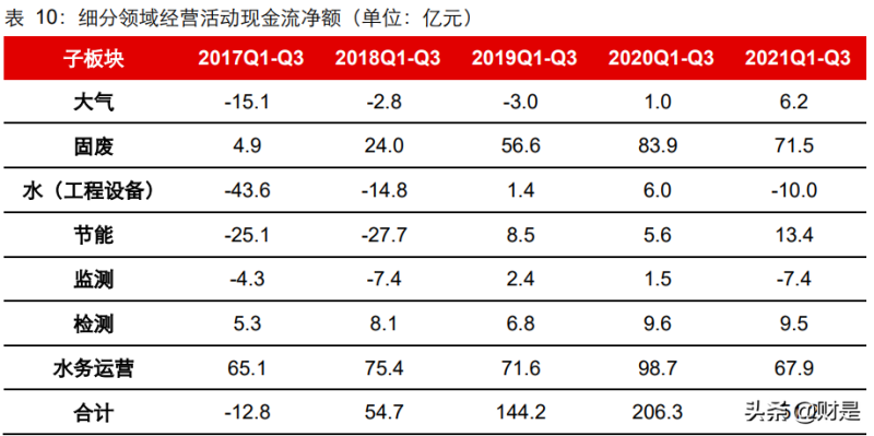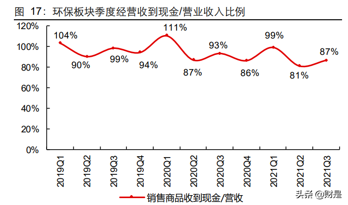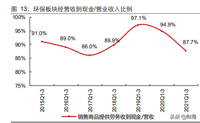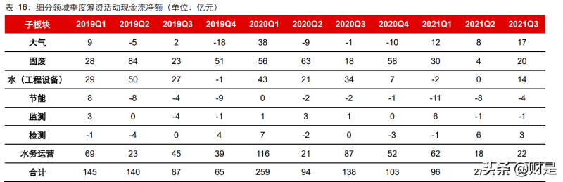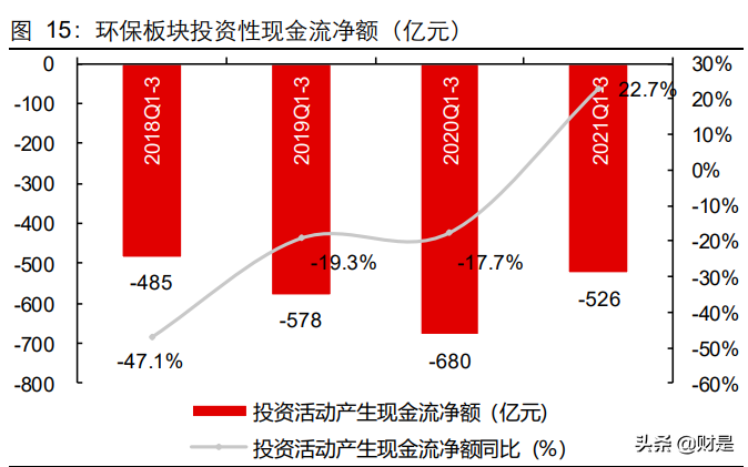現(xiàn)金流量表:收入快速增長致收現(xiàn)比下行,投融資數(shù)據(jù)環(huán)比回暖2021Q1-Q3 環(huán)保板塊銷售商品收到現(xiàn)金/營收比率(收現(xiàn)比)為 87.7%,同比降 7.2pct,處于歷史數(shù)據(jù)區(qū)間內(nèi);經(jīng)營活動(dòng)、投資活動(dòng)及籌資活動(dòng)產(chǎn)生的現(xiàn)金流量凈額分別 151 億 元(去年同期為 206 億元,同比降 27%)、-526 億元(去年同期為-680億元,凈支出同 比減少 23%)和 197 億元(去年同期為 540 億元,同比降 64%)。收入快速上行致收現(xiàn)比下降,并非回款惡化。環(huán)保行業(yè)收入存在收款周期,而收入的快速上行致當(dāng)期收現(xiàn)比下降,并非行業(yè)回款惡化。行業(yè)經(jīng)歷過2018年 PPP 現(xiàn)金流風(fēng)險(xiǎn)后,各公司重視回款,推動(dòng) PPP 項(xiàng)目轉(zhuǎn)EPC模式,工程、設(shè)備銷售等業(yè)務(wù)控制客戶質(zhì)量,并強(qiáng)化前期應(yīng)收賬款回款等,使得行業(yè)現(xiàn)金流好轉(zhuǎn),結(jié)合前文對應(yīng)收賬款的討論,也可證明回款在向好。
