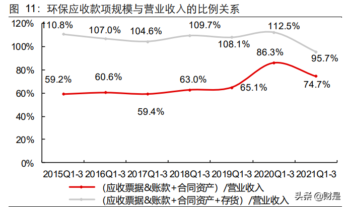 考慮到當(dāng)下部分公司將實(shí)質(zhì)的應(yīng)收賬款名義上放至存貨科目名下,故我們考慮存貨后, 2021Q3 末應(yīng)收賬款&票據(jù)+存貨+合同資產(chǎn)同比增 4.9%,(應(yīng)收賬款&票據(jù)+存貨+合同 資產(chǎn))/營業(yè)收入同比降16.8pct,變動(dòng)原因:1)水(工程設(shè)備)、節(jié)能、大氣的(應(yīng)收賬款&票據(jù)+存貨+合同資產(chǎn))絕對值有所下降,分別降 6.6%、6.4%、1.6%,強(qiáng)化了回款;2)各子行業(yè) 2021Q1-Q3 均獲得營收正增長,行業(yè)整體同比增 23.3%,特別是檢 測、水(工程設(shè)備)的同比增速在 30%以上。