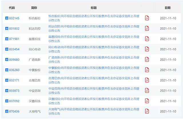 11月10日晚間,10家新三板精選層企業(yè)披露《向不特定合格投資者公開(kāi)發(fā)行股票并在北京證券交易所上市提示性公告》,均表示經(jīng)北交所同意,公司股票將于11月15日在北交所上市。
