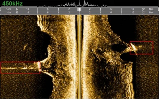 無人船走航現(xiàn)場及側(cè)掃聲納示意圖