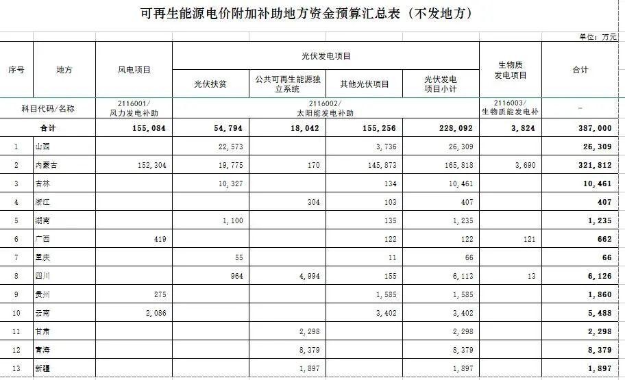 11月16日,中央預算公共平臺發(fā)布“關于提前下達2022年可再生能源電價附加補助地方資金預算的通知”。根據(jù)通知,本次下達總計新能源補貼資金38.7億元。其中,風電15.5億元、光伏22.8億元、生物質(zhì)3824萬元。