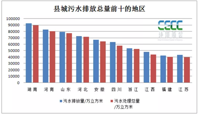 從省份來看,大部分省市數(shù)據(jù)顯示的縣城污水排放總量和處理總量之間缺口不大,達(dá)到95%以上,處理能力仍存在一定缺口的主要是西藏、海南、青海等省市。