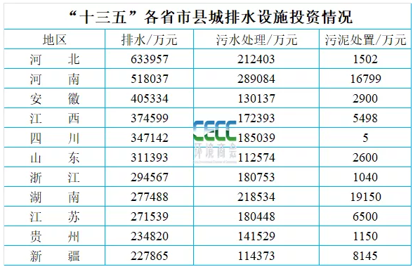 從省份來看,河北、河南、安徽等省份在縣城排水設(shè)施投入比較大,按排水投資額排名前十的省市具體情況如下: