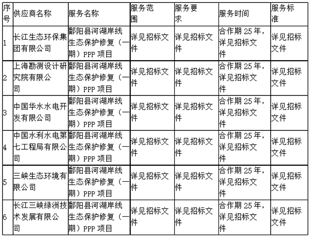 2021年11月23日,鄱陽縣河湖岸線生態(tài)保護(hù)修復(fù)(一期)PPP項(xiàng)目資格預(yù)審公告顯示,長江生態(tài)環(huán)保集團(tuán)牽頭上??睖y設(shè)計(jì)研究院有限公司、中國華水水電開發(fā)有限公司、中國水利水電第七工程局有限公司、三峽生態(tài)環(huán)境有限公司和長江三峽綠洲技術(shù)發(fā)展有限公司中標(biāo)。