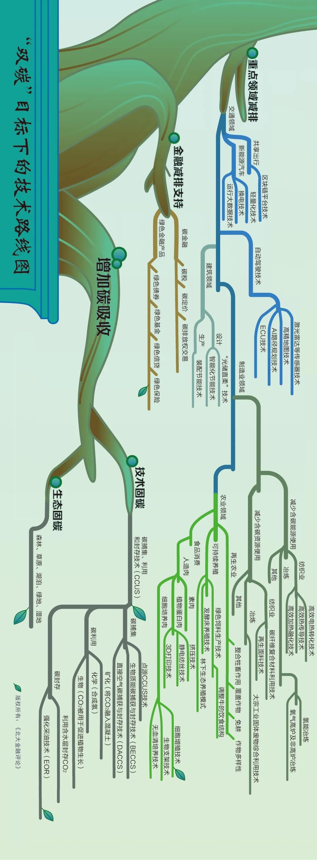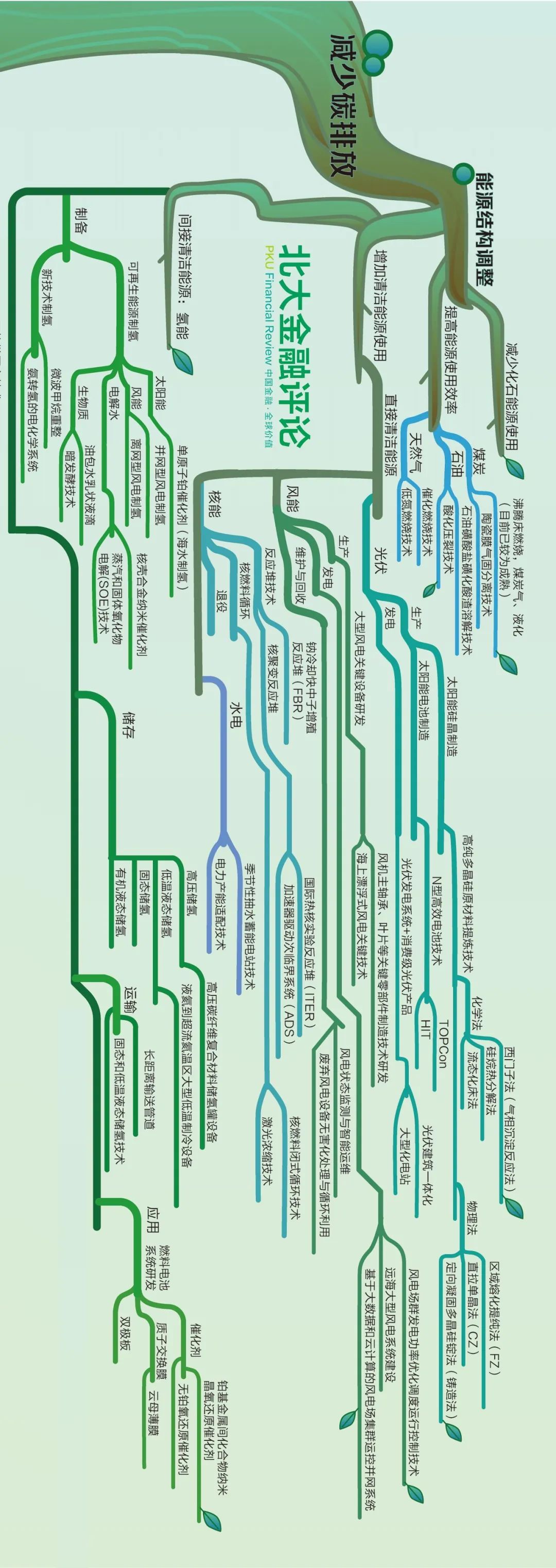 近日,《北大金融評(píng)論》發(fā)布“雙碳”目標(biāo)下的技術(shù)路線圖,包括減少碳排放和增加碳吸收2條主路線。其中,減少碳排放包括能源結(jié)構(gòu)調(diào)整、重點(diǎn)領(lǐng)域減排和金融減排支持3條路線,增加碳吸收又包括技術(shù)固碳和生態(tài)固碳2條路線。如此逐級(jí)細(xì)化,得到完整技術(shù)路線圖。