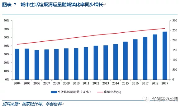 截至2019年,我國(guó)城鎮(zhèn)化率已達(dá)60.6%,提前完成“十三五”規(guī)劃提出的到2020年實(shí)現(xiàn)城鎮(zhèn)化率達(dá)到60%的目標(biāo),預(yù)計(jì)到2025年,中國(guó)城鎮(zhèn)化率有望達(dá)到66.5%。城鎮(zhèn)化率提升推動(dòng)居民生活水平的提高,進(jìn)而消費(fèi)水平提升將從源頭帶來穩(wěn)步增長(zhǎng)的垃圾清運(yùn)量。2019年我國(guó)城鎮(zhèn)垃圾清運(yùn)量達(dá)到2.4億噸,同比增加6.16%,假設(shè)2020-2025年年均增速6.5%,預(yù)計(jì)到2025年城鎮(zhèn)生活垃圾清運(yùn)量有望達(dá)3.53億噸。