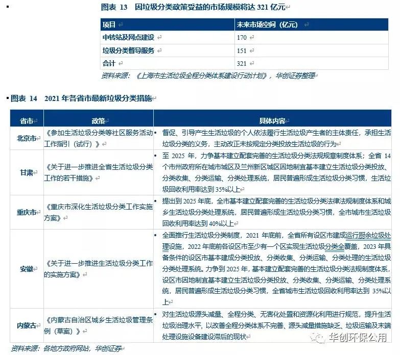 垃圾分類政策頻出,因政策受益的市場(chǎng)規(guī)模約321億。2020年11月,住房和城鄉(xiāng)建設(shè)部等部門印發(fā)《關(guān)于進(jìn)一步推進(jìn)生活垃圾分類工作的若干意見》的通知,明確力爭(zhēng)再用五年左右時(shí)間,在地級(jí)及以上城市因地制宜基本建立生活垃圾分類投放、分類收集、分類運(yùn)輸、分類處理系統(tǒng)。2019年6月,住房和城鄉(xiāng)建設(shè)部等部門出臺(tái)了《關(guān)于在全國(guó)地級(jí)及以上城市全面開展生活垃圾分類工作的通知》,明確了“以建立46個(gè)重點(diǎn)城市垃圾分類處理系統(tǒng)為第一步,并逐步實(shí)現(xiàn)全國(guó)地級(jí)及以上城市的生活垃圾分類處理系統(tǒng)的建設(shè)”目標(biāo)。我們認(rèn)為垃圾分類政策的進(jìn)一步推進(jìn)和落實(shí)有望顯著帶動(dòng)垃圾中轉(zhuǎn)站、回收網(wǎng)點(diǎn)和督導(dǎo)、清運(yùn)服務(wù)需求的提升,未來市場(chǎng)空間約321億元。