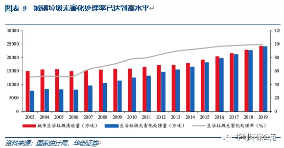 就當(dāng)前而言,我國(guó)城鎮(zhèn)垃圾無害化處理率超過99%,絕對(duì)量持續(xù)增長(zhǎng)。2019年我國(guó)城市垃圾清運(yùn)量為2.42億噸,其中生活垃圾無害化處理量2.4億噸,占比99.2%,同比提升0.3個(gè)百分點(diǎn),目前城市垃圾無害化處理率已達(dá)到高水平。而生活垃圾無害化處理量近十年CAGR為7.9%,保持高速增長(zhǎng)。