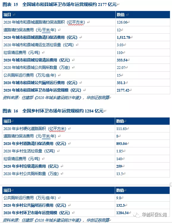 根據(jù)2020年中國(guó)城鄉(xiāng)建設(shè)統(tǒng)計(jì)年鑒,全國(guó)城市和縣城道路清掃保潔面積將達(dá)126.06億平方米,生活垃圾清運(yùn)量約3.03億噸,公共廁所數(shù)量將達(dá)22.07萬座。將經(jīng)典環(huán)衛(wèi)項(xiàng)目的費(fèi)用代入數(shù)據(jù)中,我們測(cè)算出全國(guó)城市和縣城環(huán)衛(wèi)市場(chǎng)年運(yùn)營(yíng)規(guī)模約為2177.42億元。全國(guó)鄉(xiāng)村道路清掃保潔面積將達(dá)91.24億平方米,生活垃圾清運(yùn)量約1.85億噸,公共廁所數(shù)量將達(dá)12.95萬座。同樣將以前經(jīng)典環(huán)衛(wèi)項(xiàng)目的費(fèi)用代入數(shù)據(jù)中,我們測(cè)算出全國(guó)鄉(xiāng)村環(huán)衛(wèi)市場(chǎng)年運(yùn)營(yíng)規(guī)模約為1284.34億元。加上此次垃圾分類帶來的空間提升,當(dāng)前環(huán)衛(wèi)市場(chǎng)規(guī)模約為3800億。