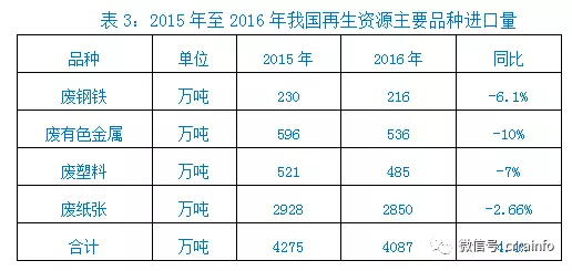 3、進(jìn)口量。2016年,我國(guó)廢鋼鐵、廢有色金屬、廢塑料、廢紙4個(gè)品種的進(jìn)口量達(dá)4087萬(wàn)噸,比2015年同比下降4.4%(見(jiàn)表3)。進(jìn)口量同比下降的原因,是環(huán)保監(jiān)管趨嚴(yán),國(guó)家收緊固廢進(jìn)口政策。