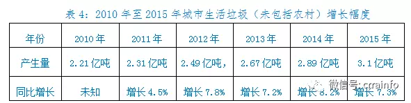 4、近五年全國(guó)城市生活垃圾增長(zhǎng)幅度。中再生協(xié)會(huì)專(zhuān)家組通過(guò)實(shí)地調(diào)研及查閱相關(guān)部門(mén)資料發(fā)現(xiàn),2010年,全國(guó)城市生活垃圾產(chǎn)生量2.21億噸,到2015年,全國(guó)城市生活垃圾產(chǎn)生量增長(zhǎng)到3.1億噸,5年間城市生活垃圾平均年增長(zhǎng)7.54%,其中2014年比2013年同比增長(zhǎng)8.2%(見(jiàn)表4)。