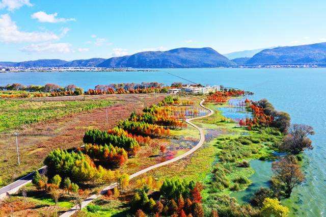 星云湖西岸的中山杉豐富了沿岸植物種群。(11月19日攝)。新華網(wǎng)發(fā)(江川區(qū)融媒體中心 供圖)