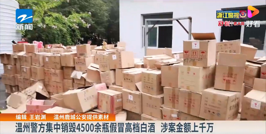 原來,11月18日,浙江省溫州市鹿城區(qū)公安在當(dāng)?shù)氐挠兰挝鬯幚韽S,集中銷毀了4500余瓶假冒高檔白酒,其中主要是飛天茅臺和五糧液。