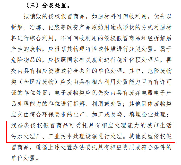 液態(tài)類侵權(quán)假冒商品可委托具有相應(yīng)處理能力的城市生活污水處理廠、工業(yè)污水處理設(shè)施進(jìn)行處理。