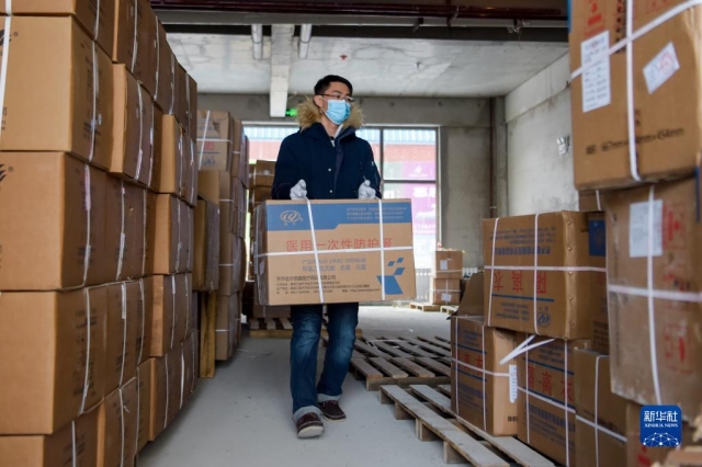 11月30日,在位于滿洲里市臚臏社區(qū)的臨時(shí)物資存放點(diǎn),工作人員在清點(diǎn)醫(yī)用物資。新華社記者 李志鵬 攝