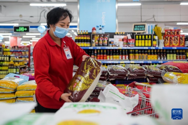 11月30日,在滿洲里市慶客隆超市,工作人員在揀貨。滿洲里市居民可通過線上方式下單,工作人員根據(jù)訂單揀貨后由配送人員送貨。新華社記者 李志鵬 攝